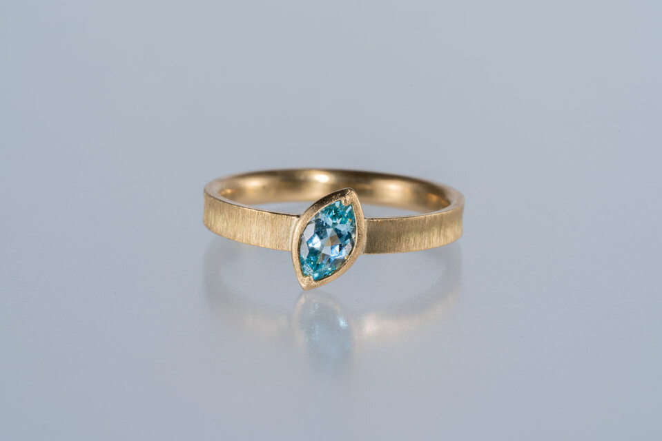 アクアマリンのブルーの落ち着いた雰囲気とゴールドの華やかさを組み合わせました。
