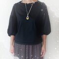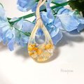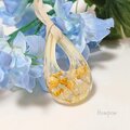 イエローベースのドライフラワーと白いパール、クラッシュシェルなどを飾って大きめの雫型のネックレスを作りました。