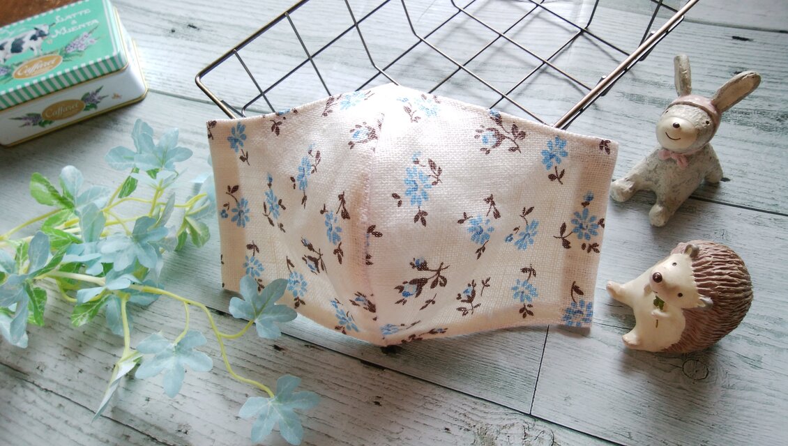 送料無料✴生成りに爽やかなブルーの花柄マスク✴裏地は涼感加工ガーゼ使用✴