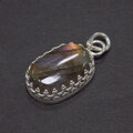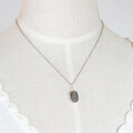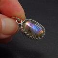 光の当たる角度によって、オレンジ、パープル、ブルーなどの様々な色彩を浮かべるラブラドライトを飾り枠のペンダントに仕上げました。