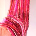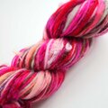 ベリー系の色と茶系の色が繰り返されるモヘア入りの糸ですところどころに特殊なラメファイバーやモヘアのカール毛が入っています。