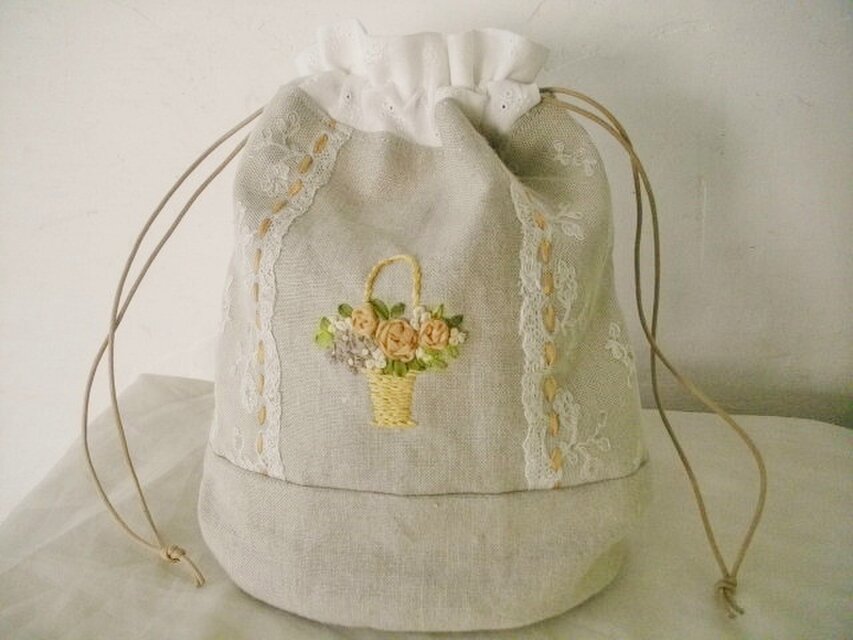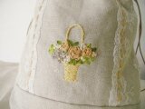 シックな色合いのリボンでフラワーバスケット花かごを刺しゅう
