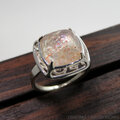 独特の内包物の中に、こまかな虹がキラキラと見えるサンストーンのリング。