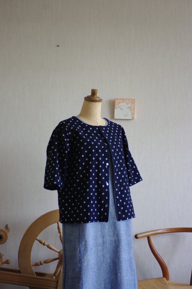 濃紺地にアイボリー色の小さな水玉模様が織られています。