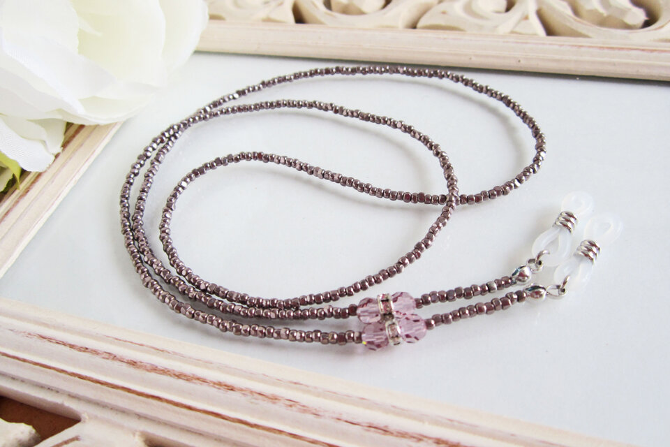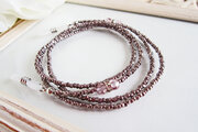 パープルにボルドーを足したようなニュアンスカラーのビーズを使用した眼鏡チェーン。