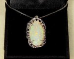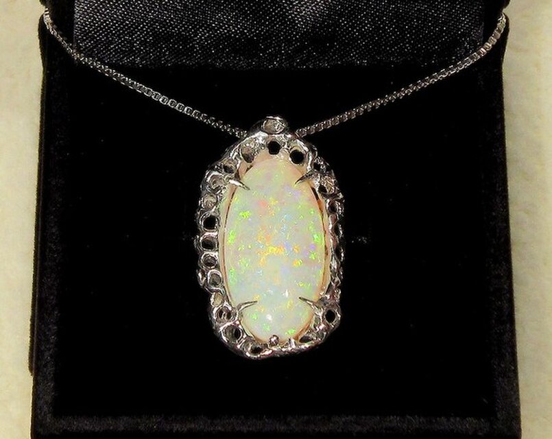 星空の様な綺麗な発色が浮かぶオパールを留めたSV925製のトップと、同じくSV925製のスライド式チェーンのネックレスです(トップとチェーンは共にロジウムの厚メッキ)。