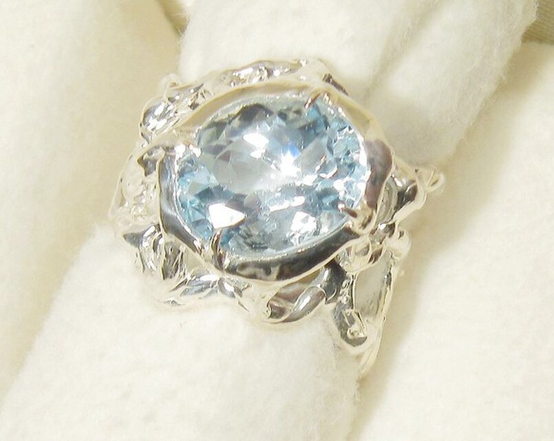輝きのとても強いオーバル・カットのブルートパーズを留めた指輪です。