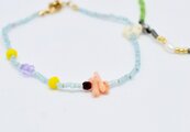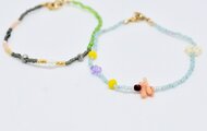 ポップなカラーのお花に編んだビーズや淡水パール、天然石、チェコビーズなどを組み合わせて作っています。