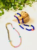 ポップなカラーのお花に編んだビーズや淡水パール、天然石、チェコビーズなどを組み合わせて作っています。