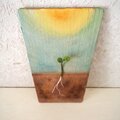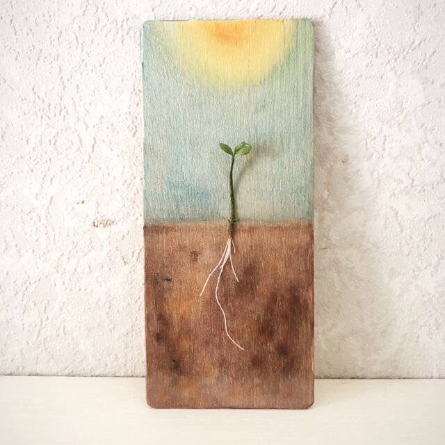 空にすくっと伸びる双葉には、ガラスの雫がついています。