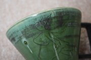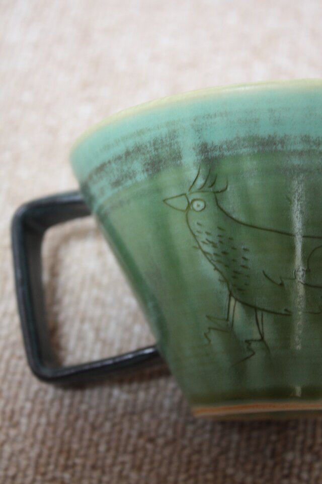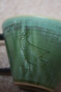 全体に織部釉がかけてありますが、取っ手は黒土なので青みがかっています。