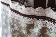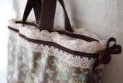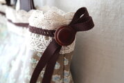 こっくりとした秋らしいマロン色の生地に、リネンのレース2種類と、ダークブラウンのはしごレースをあわせました。また、バッグサイドにはグログランリボンと、しっとりとした風合いの可愛らしい革のボタンをつけてアクセントに。