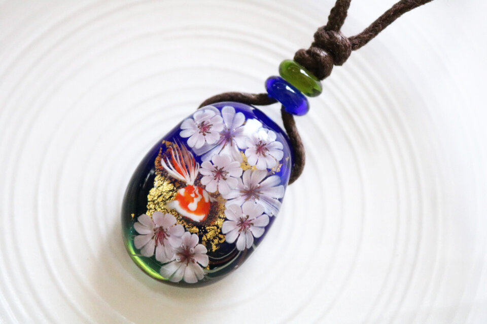 桜と金魚は表面に描いたのではなく、ガラスでパーツを作り溶かしたガラスに埋め込みながら制作しております。