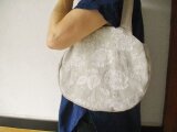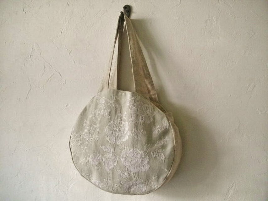 エクリュリネンとフランス製のアンティークファブリックの丸いトートバッグです