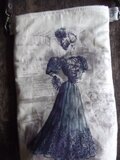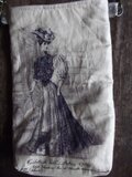 セピア色の中世の貴婦人が描かれたプリントのポーチです。内側は花柄のキルティングで小さなマグネットボタンボタンがついています。