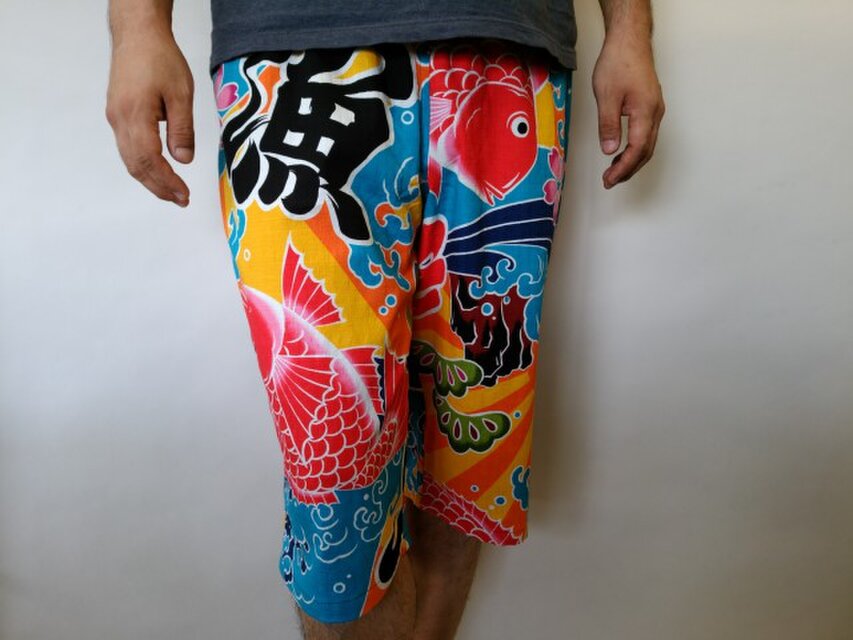 縁起の良い大漁旗柄のショートパンツです。