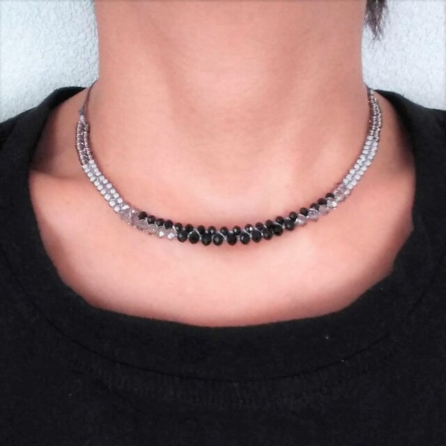 ボタンカットの黒とスモーキーグレーのビーズを、デコルテに沿うようにカーブに編みつけた金属不使用のチョーカーです。