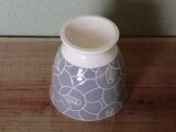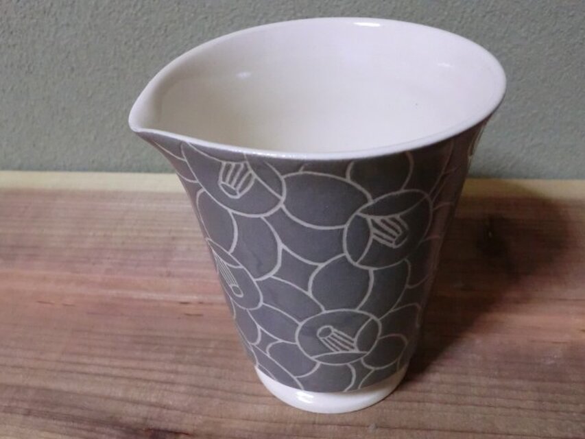 渋いグレーの化粧土に白い線で椿をでざいんしています。