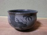 黒泥土にグレーの化粧土を施したぐい呑みに、昇り龍をデザインしました。