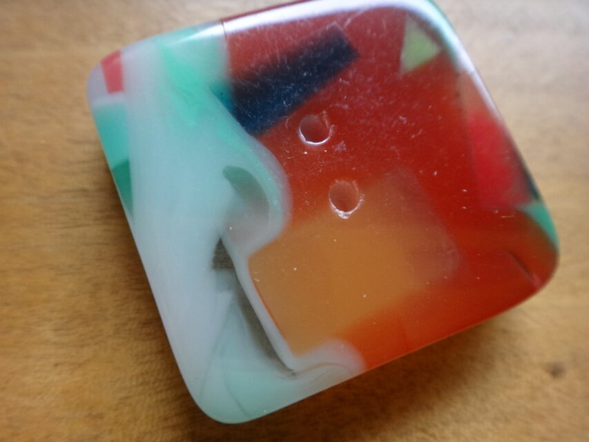 ポリエステル樹脂出色を作り流し固め、カットしてまた流し込みという作業を5~10回繰り返して作ったボタンです。同じ柄は二つとありません。