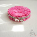 3mmのビーズをひとつぶづつ、まるい編み地全面に編み込みました。