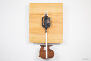 文字盤の部分は、天然檜の外皮を円形に掘り込んでつくり、マホガニーからゴシック調の数字をひとつひとつ切り出して配しましたので、立体的な陰影で視認性が大変よくなっています。時刻目盛には、薄い緑色のスワロフスキーを用いました。