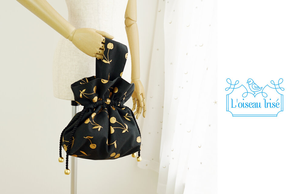 マットゴールドのさくらんぼプリントが大人キュートなキャンバスで、可愛いディティールいっぱいの巾着バッグを仕立てました。