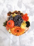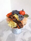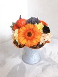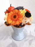 ブリキの花器に、プリザーブドフラワーのガーベラやバラ、アジサイ、カボチャのオーナメントやリーフ、ハロウィン仕様のリボン等を使用し、オレンジを中心としたハロウィンカラーでシックな仕上がりのアレンジになっています。
