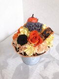 プリザーブドフラワーを使用して作成した、ブリキの花器のハロウィンアレンジです。