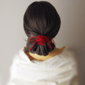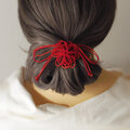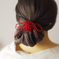 まず最初にゴム部分で髪をまとめ、垂れている紐部分をそのゴム部分の上から巻きつけて使用することにより「和」な雰囲気のまとめ髪を楽しもうと言う趣向で作りました
