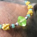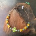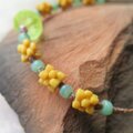 山吹色のフラワービーズと緑のカカンバを交互につなぎ、間にノットを結んでいます。
