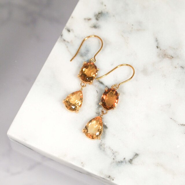 色の濃いブランデーシトリンと、通常のシトリンを使用したフックピアスです。
