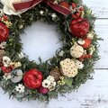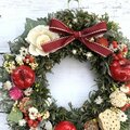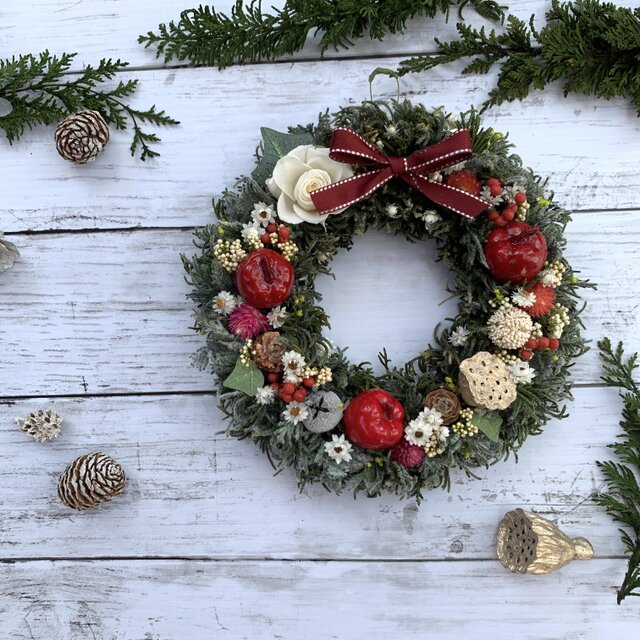 ホワイトローズと赤いリンゴをメインに、木ノ実やペッパーベリーをふんだんに使ったクリスマスリースです。