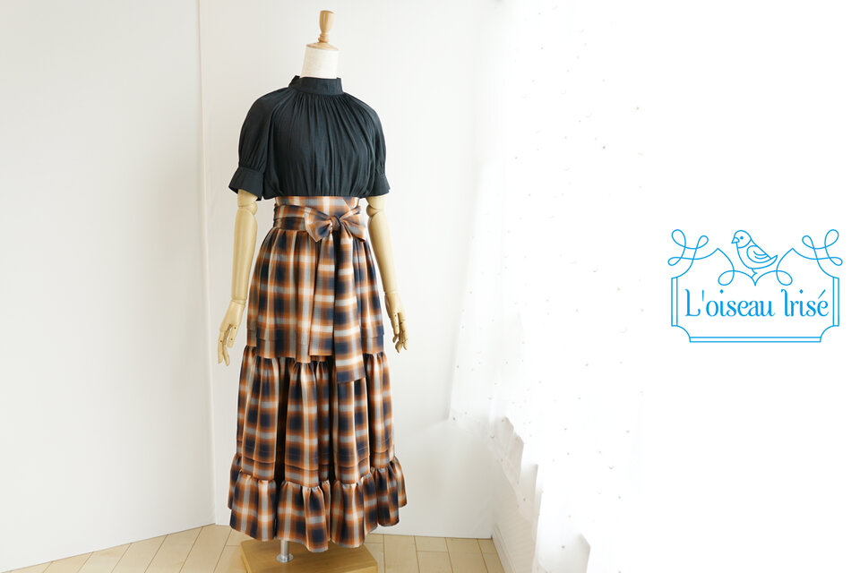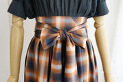 オレンジとネイビーの濃淡が可愛いオンブレチェックで、ギャザーたっぷりのティアードスカートを仕立てました。