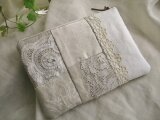 背面はエクリュリネンにリーフのモチーフレースをアップリケしています