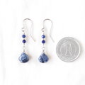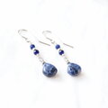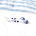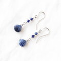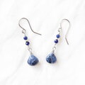 濃淡が味わい深いマロン形状のソーダライトにカットがキラリと輝く小粒のソーダライトを合わせ、アクセントにシルバー色のグラスビーズを添えたナチュラルで上品な雰囲気のピアスです。