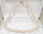 照りがとても強い本真珠(淡水パール)のネックレスです。淡いピンクの色合いはナチュラルカラーです。