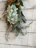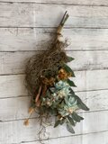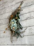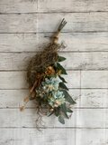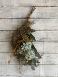 ブルーのグラデーションダリアにブラウンのローズとユーカリ・グラスブッシェ・スパニッシュモスを束ねたスワッグです。