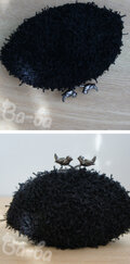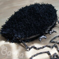 黒色のふわふわフェザーヤーンをふんわりと編み上げ、小鳥の口金と組み合わせました。