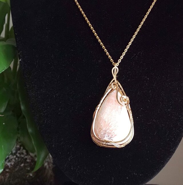 アイボリーホワイトの地に朱鷺の羽根のような模様のピンクスコレサイトを14金ゴールドフィルドワイヤーでラッピングしました。