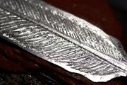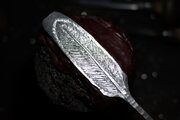 鍛造した地金から羽根の形を切削。洋彫りによって重厚で無骨ながら繊細な彫りが施されています。