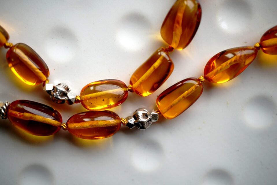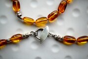 バルト海沿岸で産出される美しい飴色の琥珀をシルク糸で結びながらつなげていったネックレスです。長さが10~12mm程度、ころんとした石ころのような形をしています。