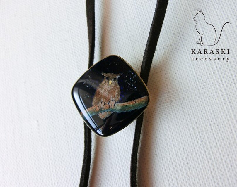 ふくろうを描いたオリジナルイラスト(原画)をレジンでとじこめましたループタイです。