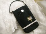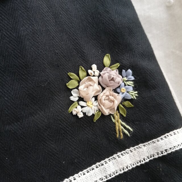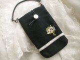 黒ヘリンボーン(杉綾織)リネンにリボン刺繍とフランス刺繍でブーケを刺したスマホポーチです