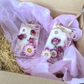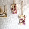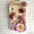 ミルキーカラーのサシェの上にピンクのドライフラワーたちを飾りました。