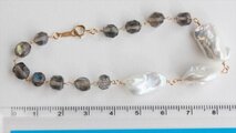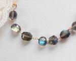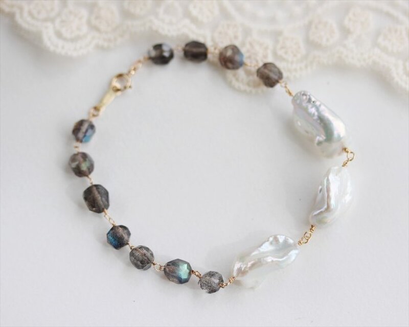 今回は宝石質のラブラドライトとふんわりした大粒のケシパールをアシメントリーに繋げたブレスレットを作りました。