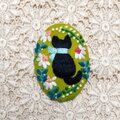 オリーブグリーンのコットン地に子ねこと小さなお花の大人可愛い手刺繍のブローチです。