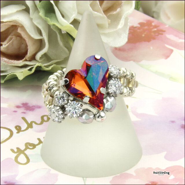 ビーズ,リング,コスチュームジュエリー,ビーズアクセサリー,ビーズリング,ビーズ指輪,誕生日,バースデー,スワロフスキー,ピンク,オレンジ,ハート