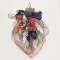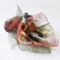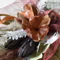 これらを束ねて、ボルドーとモスグリーンのシナマイ(麻の布)で包み、ラフィアをリボンにしました。