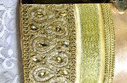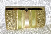 表地はゴールド系のリボンを一本一本ハンドメイドにて組み合わせて一枚布としてデザインした、唯一無二の物で他に同じ物は全くありません。